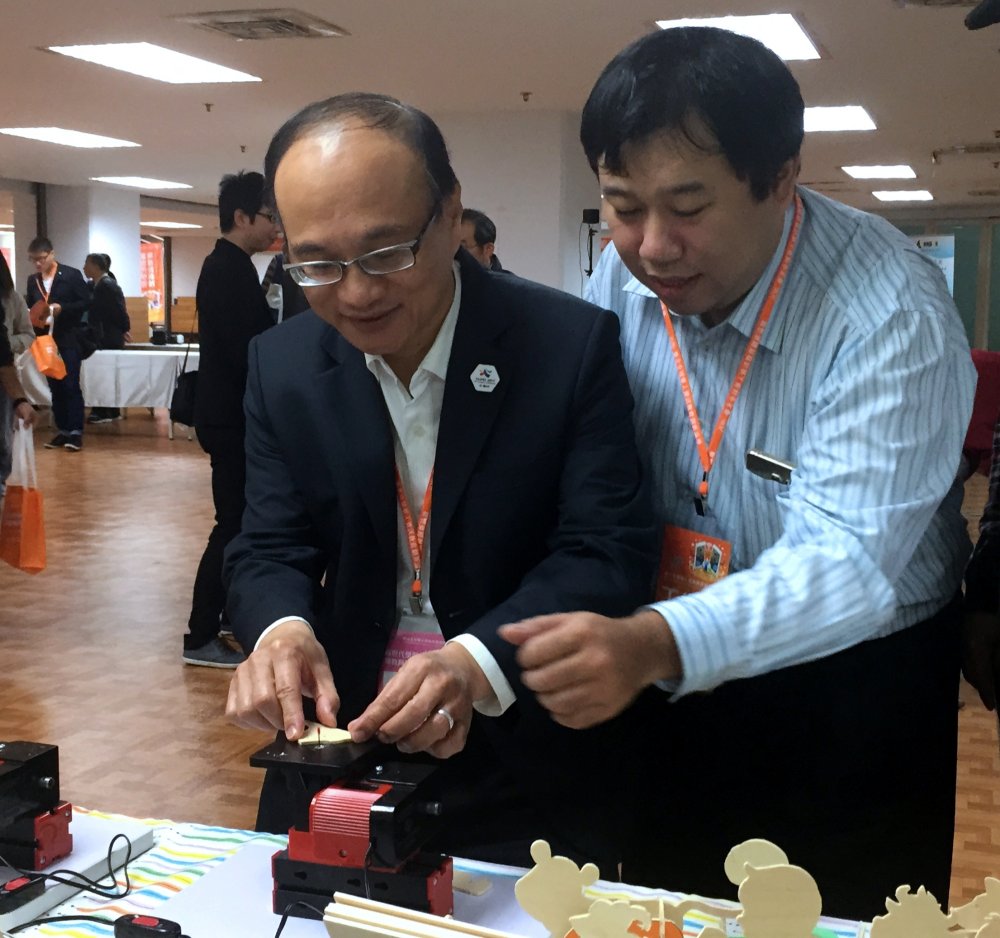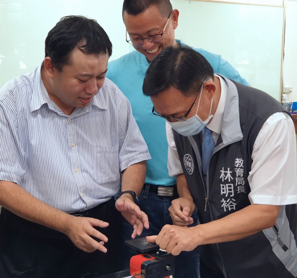 時任臺北市市長柯文哲與教育局長曾燦金、桃園市教育局長林明裕於使用鋸床時,