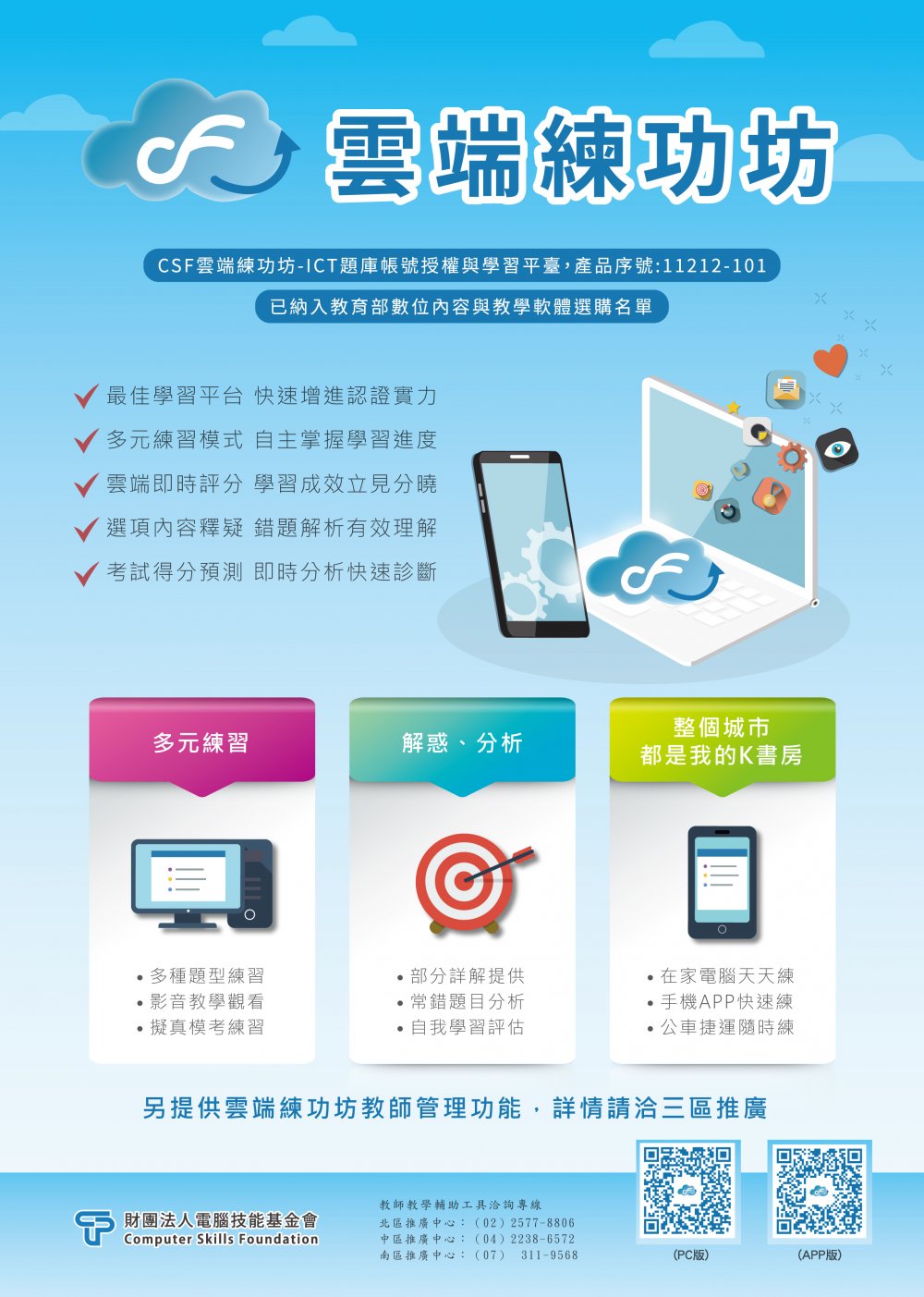 CSF雲端練功坊含括TQC/TQC+/ITE/EEC/CWT等多項認證題庫,提供多元練習/結果分析/練習紀錄等多種功能,並搭配三種智能出題模式(隨機快速/特定領域/擬真模考)可準確評估練習者的實力,針對練習者的作答能力與答題狀況進行評估,『擬真模考練習』依照正式考試組卷比例進行模擬考試,精準分析預測,可快速增進練習者的實力,提高取證機率。