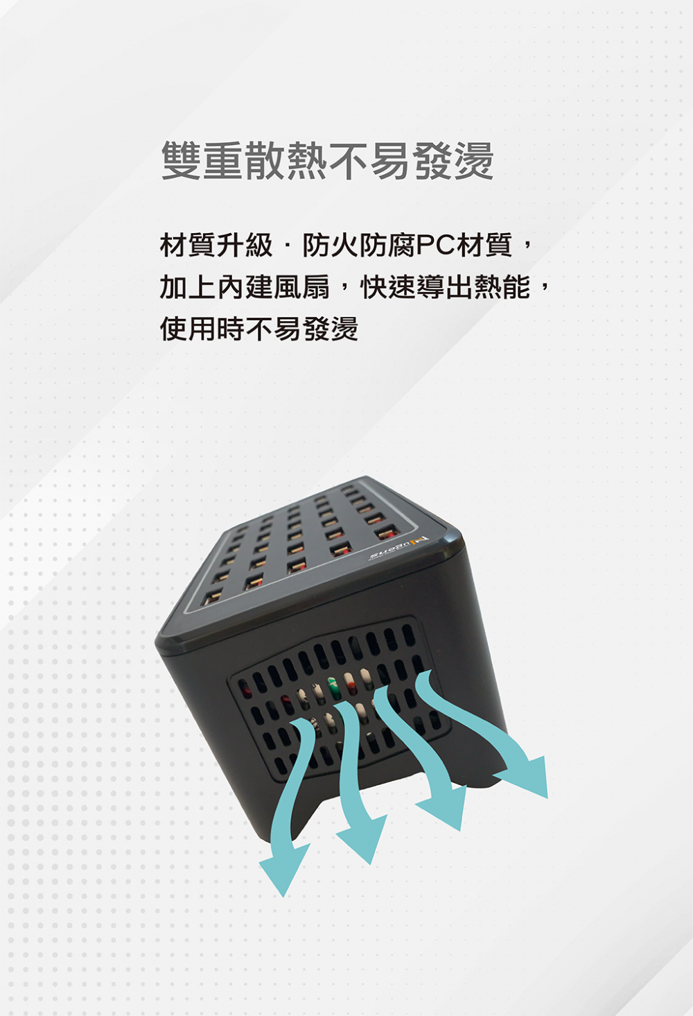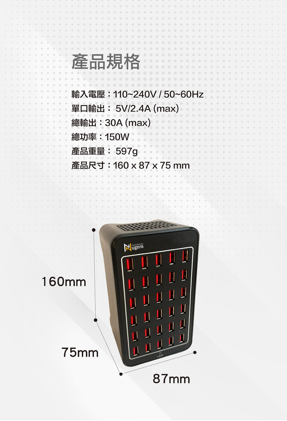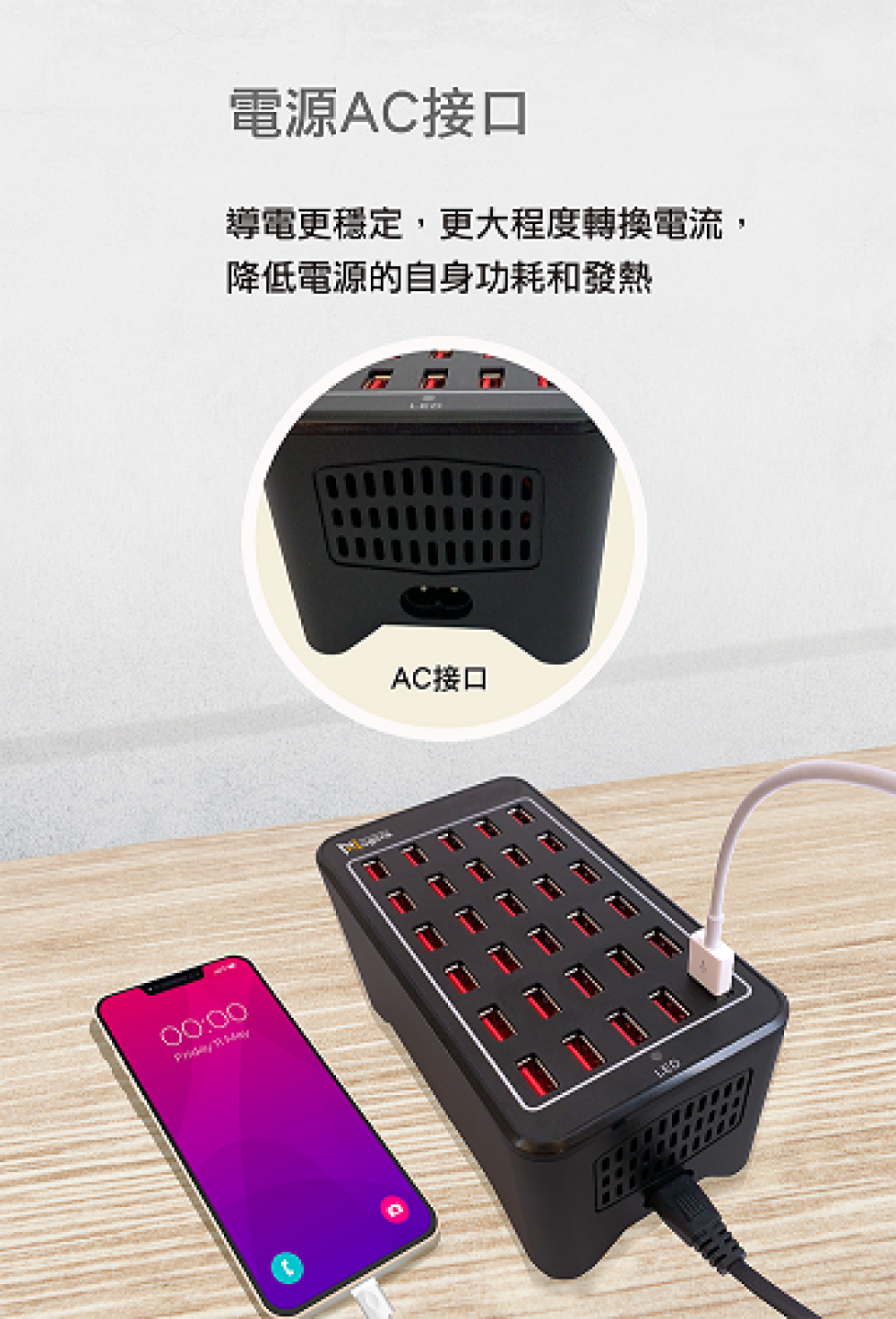 ● 5V / 1A 分流輸出滿足同時30台設備充電