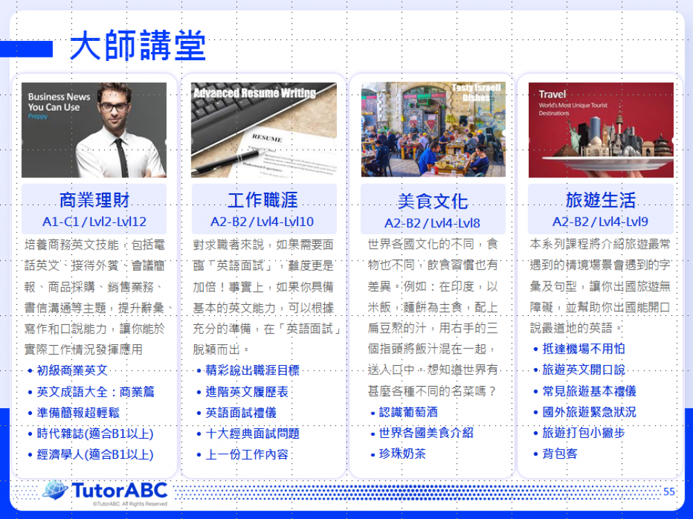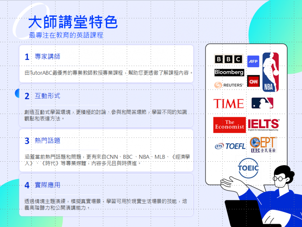 TutorABC大師講堂致力於為學員提供高品質的英語學習體驗。課程涵蓋多元主題,包括時事、商業、時尚、娛樂等,並使用來自CNN、NBA、TIME等國際知名媒體的教材。課程中引入實例分析和討論,能增加英文知識的深度及廣度,並透過與老師和同學的互動,提升在真實工作或生活場景中的溝通技巧及應用能力。