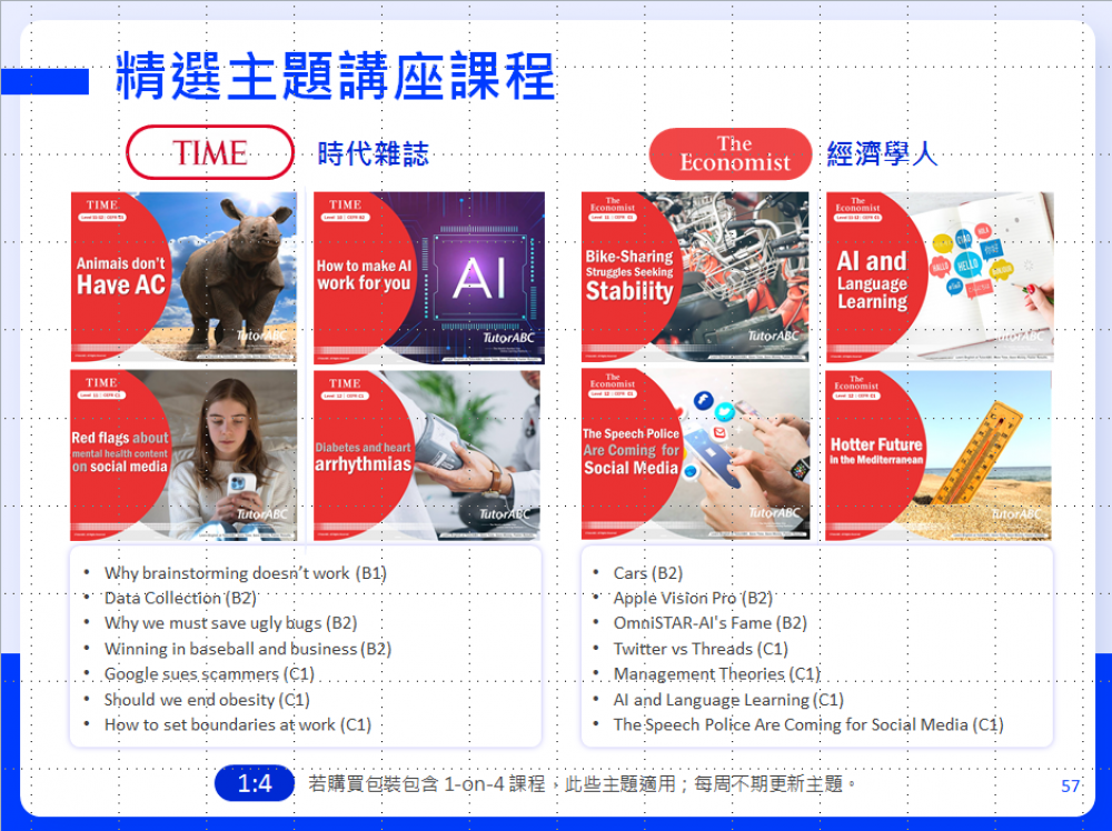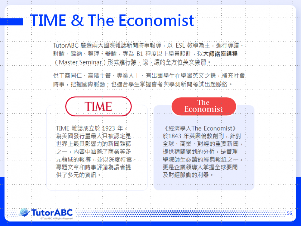 課程更嚴選TIME和經濟學人The Economist兩大國際雜誌的新聞報導,以大師講座課程形式進行聽、說、讀的全方位英文