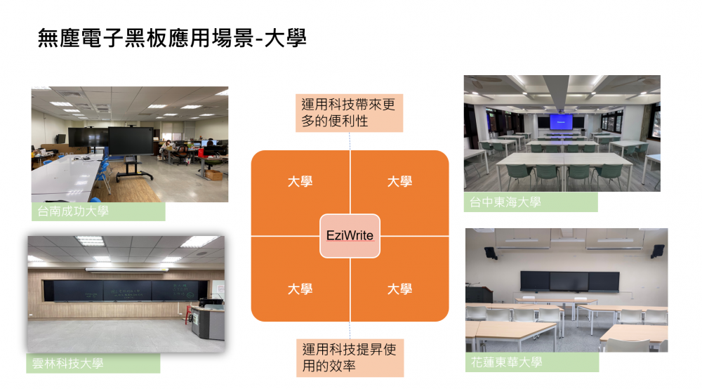 因現在大部份教室有教育白板,我們將傳統白板或是黑板換成我們的無塵電子黑板