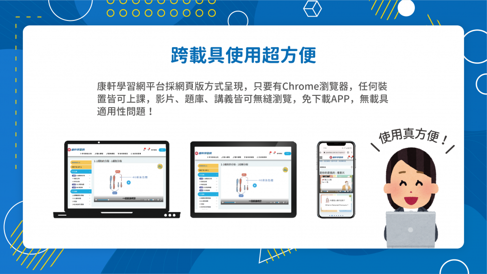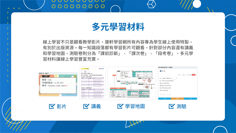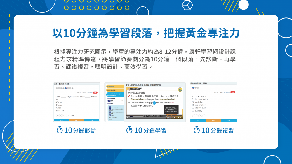 康軒學習網適合國小、國中生,跟著學校的課程進度,在家自主學習。康軒學習網將每個學習段落切分為10分鐘,將龐大的學習內容拆分成小段落,呼應108課綱「不要背不動的書包,要培養帶著走的能力」,讓孩子能夠輕鬆融會貫通、高效率學習。