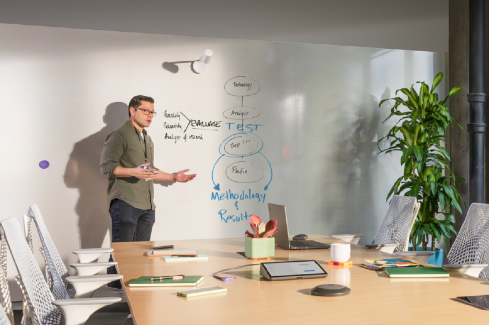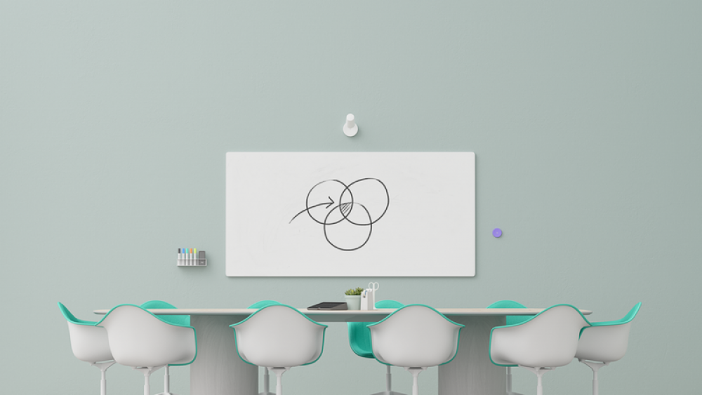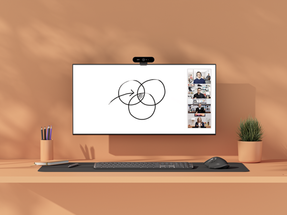 利用羅技 Scribe 在視訊會議中輕鬆分享白板內容,這是一款具有 AI 技術的白板攝影機,可搭配 Microsoft Teams® Rooms、Zoom Rooms™、Google Meet Rooms 以及其他領先的視訊會議服務使用。