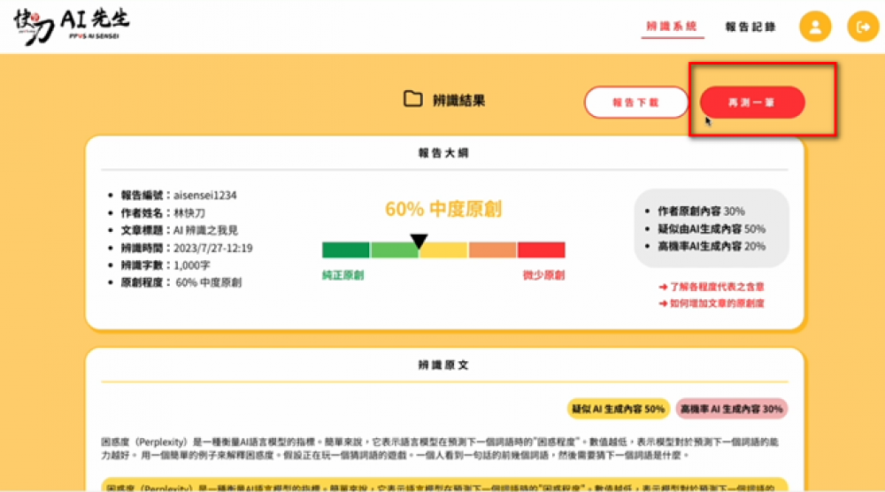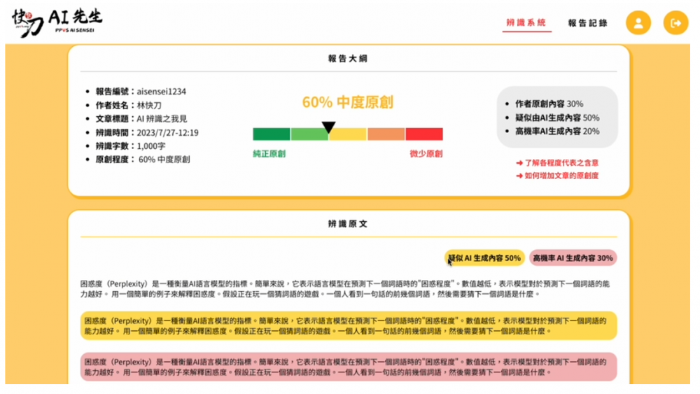 ※ 利用快刀專利核心技術,結合困惑度分析文本中的語言特徵,如句子結構、語法、用詞等,以辨識由 GPT4、GPT3、GPT2、BERT、Jasper等AI語言模型所生成的文章。此外,快刀AI先生還能識別出文章是否※ 使用翻譯軟體,為您提供全方位的文本分析與辨識服務。