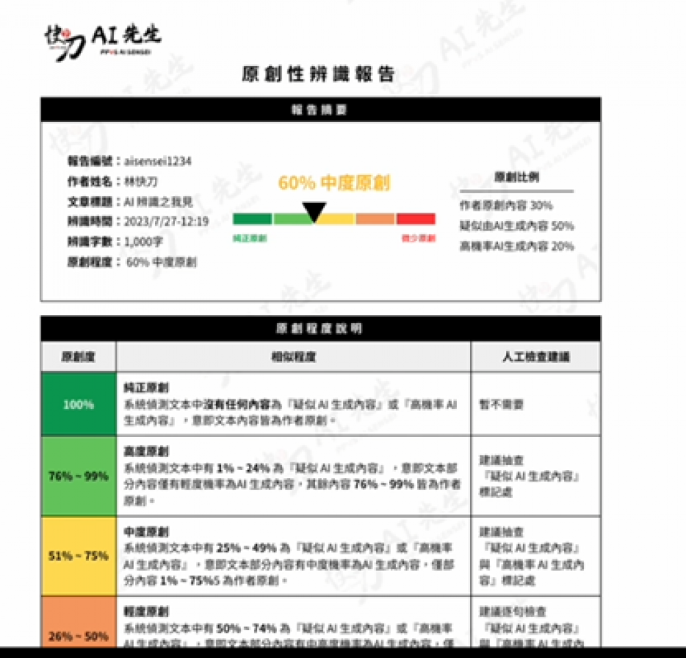 ※ 利用自然語言技術與機器學習技術分析文章內的語言特徵,如句子結構、語法、用詞等,即便經過內容重 組,同樣可準確判斷AI生成的文字段落。