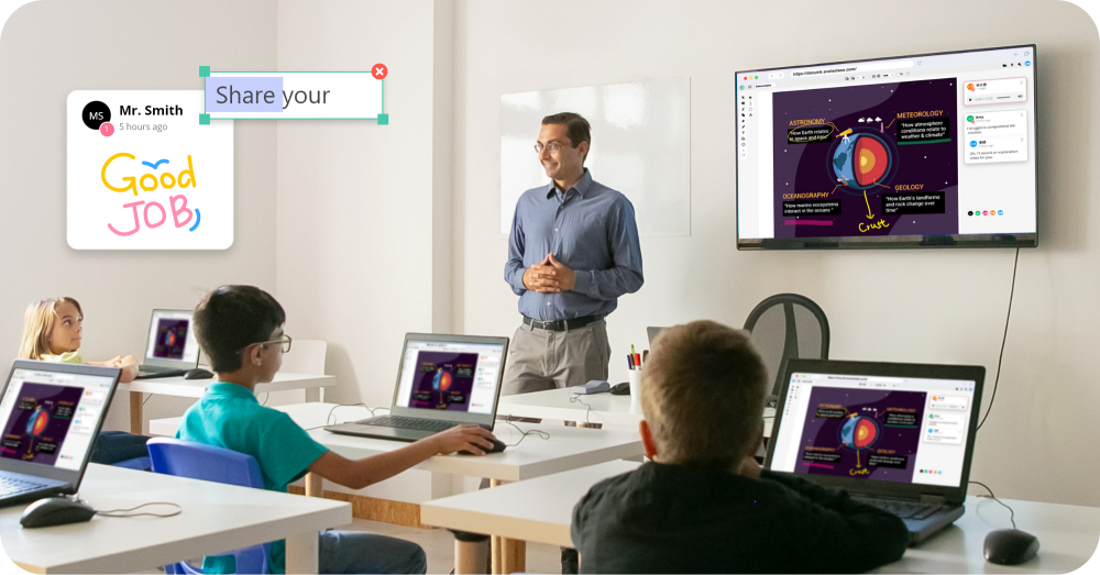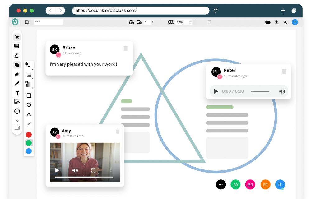 DocuINK 為優化教學流程的必備工具,提供多種PDF影音留言,例如: 螢幕錄影、Webcam人像錄影、圖片、聲音、文字等,將留言新增至文件上的任何區塊,快速與學生溝通,輕鬆錄公式演算過程給學生,學生也能在PDF上回覆留言,還可批改考卷並給任何建議! 同時支援多人共同編輯、批註、加留言於PDF,團隊溝通簡單又順暢!