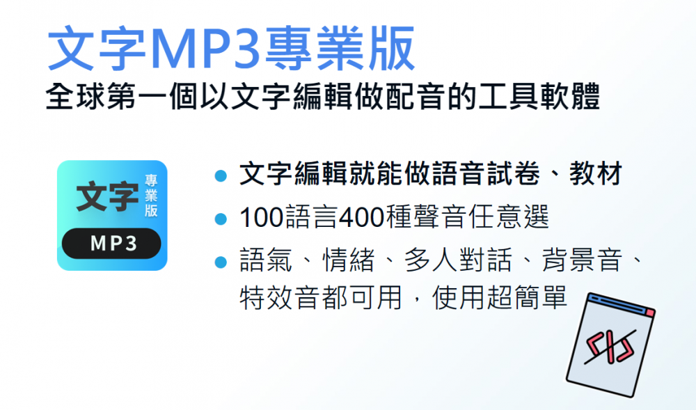 「文字MP3專業版」提供高品質AI語音合成及變音技術,大幅提升AI語音合成的品質,可以快速製作多人對話有聲內容,將大量文字對話内容轉換為聲音檔,提供更加栩栩如生的真人高品質聲音。