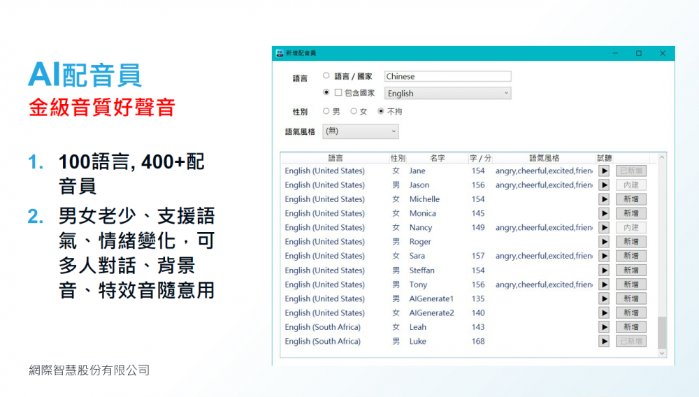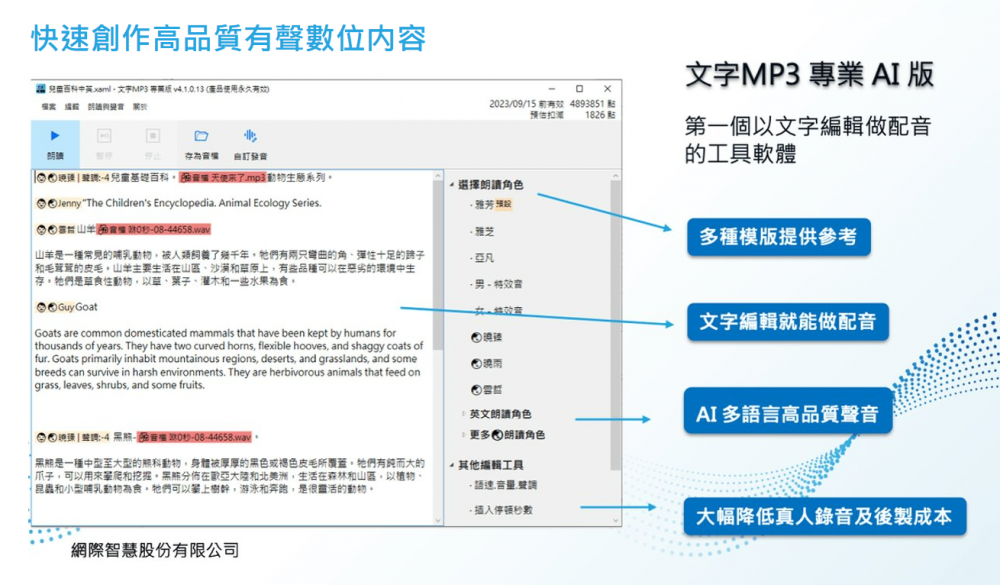 2. 提供更多不同風格的發音人聲音供選擇,在同一篇文章中,可以切換為不同發音人朗讀內容,並且輸出為MP3或是WAV聲音檔案。