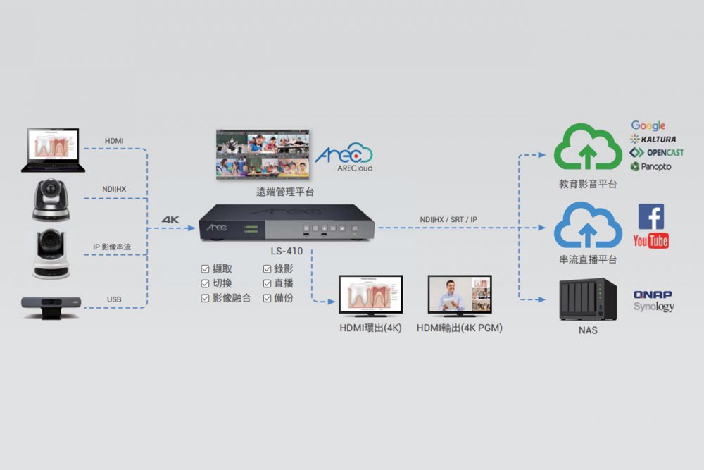 3.秉持簡單易操作的設計理念,AREC智慧錄播站降低複雜廣電級影音設備使用門檻,加入網通元素,一機實現多畫面同步擷取、導播切換、網路直播、多路影像完整錄製及影音物聯網功能。