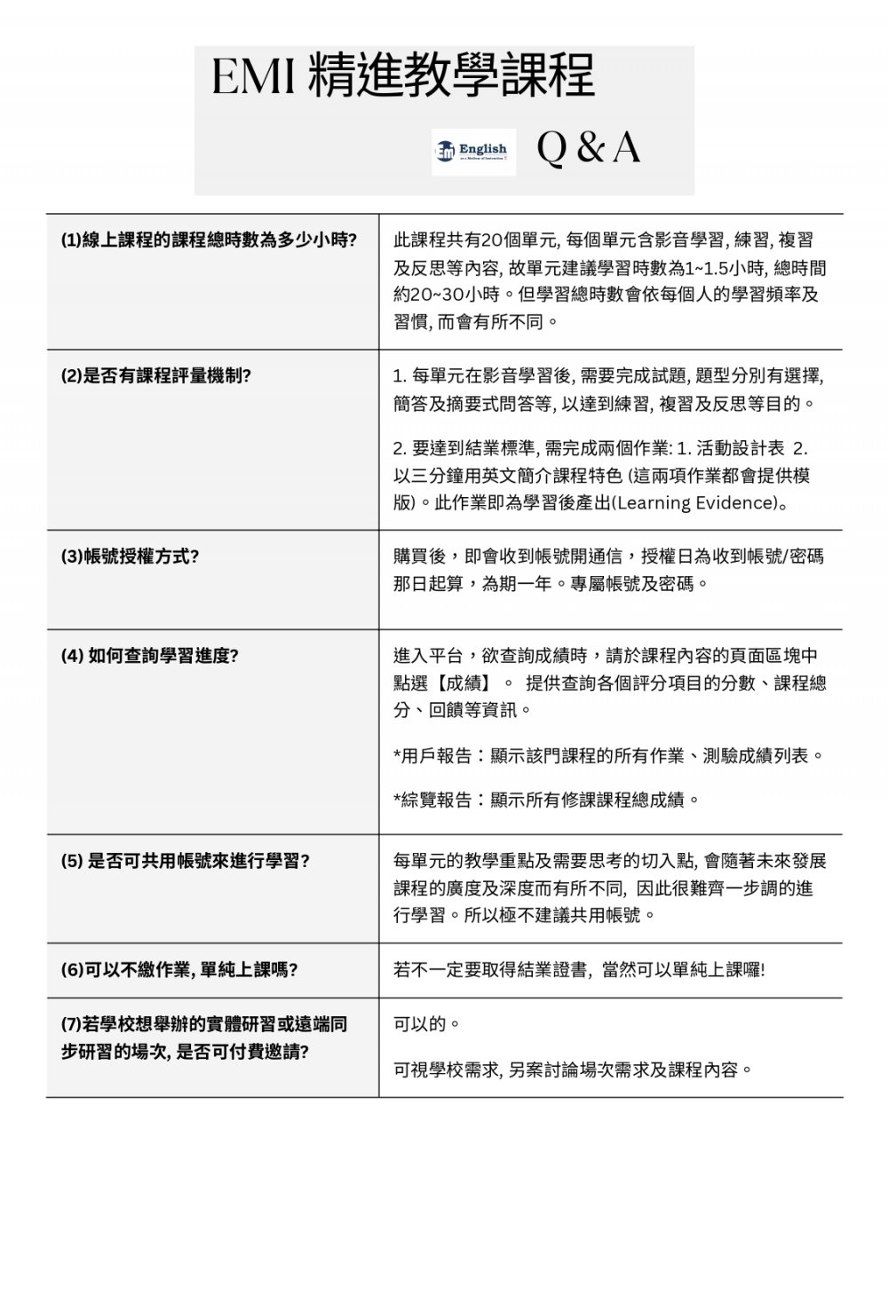 1. Introduction – EMI基本觀念的建立。EMI 課程不單單是將原本內容改用英文講一次這樣簡單,而是要設計出“深具學習意義”的課堂活動來配套。若老師可以建立起創新的 EMI 心態思維,在後續課程活動設計上將可更得心應手。