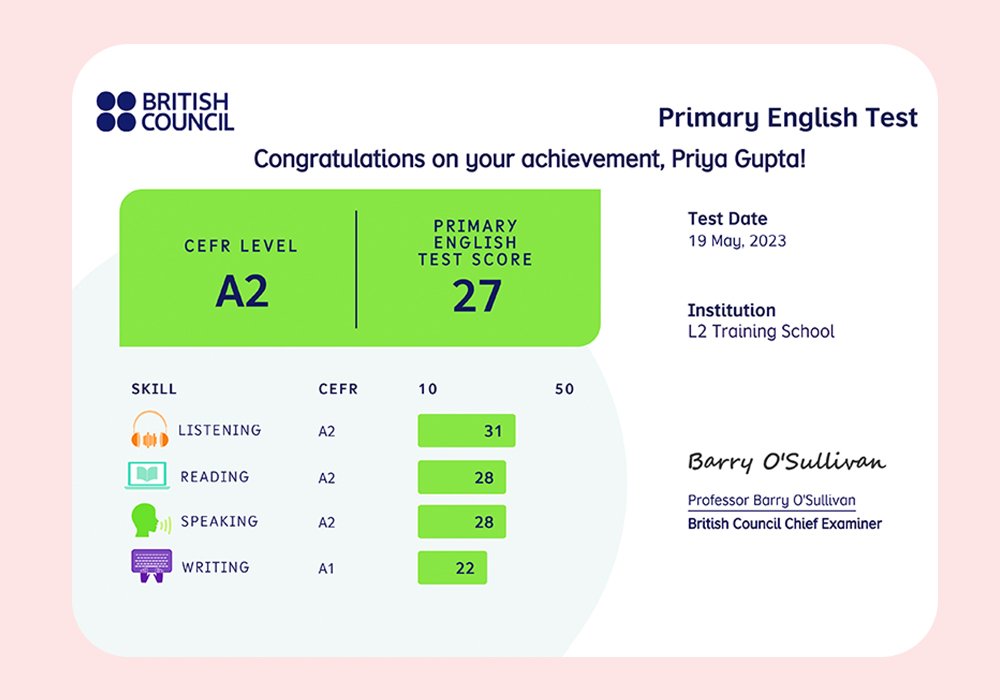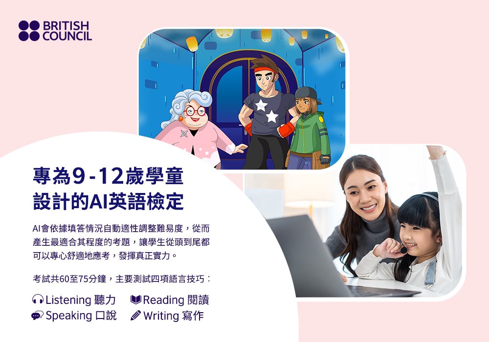 When they’re engaged, they give more. 專為9-12歲學童所設計的AI英語檢定,考試共60至75分鐘,內容設計為遊戲化、故事性的數位考題,考生將跟隨有趣的角色穿梭各種情境,從而提高參與度。AI會依據填答情況自動適性調整難易度,從而產生最適合其程度的考題,讓學生從頭到尾都可以專心舒適地應考,發揮真正實力。主要測試四項語言技巧: Listening 聽力, Reading 閱讀, Speaking 口說, Writing 書寫。