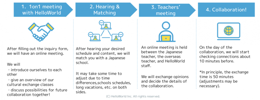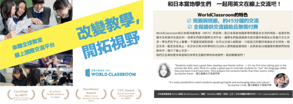 【英語教育✖️文化交流】我們是來自日本沖繩的HelloWorld,目標是希望人人都能在異國結交到當地的新朋友,無限擴展人生視野。我們被日本經濟產業省選定爲教育技術工具,我們與教育委員會合作,將我們的項目引入初中和高中。世界教室-把世界各國的教室聯繫起來!想讓您的學生有機會接觸國外的學生嗎?目的是給學生更多的國際交流空間,不帶任何商業目的。