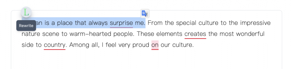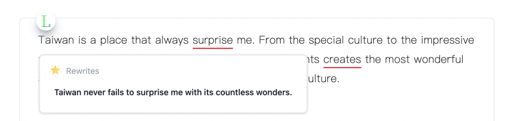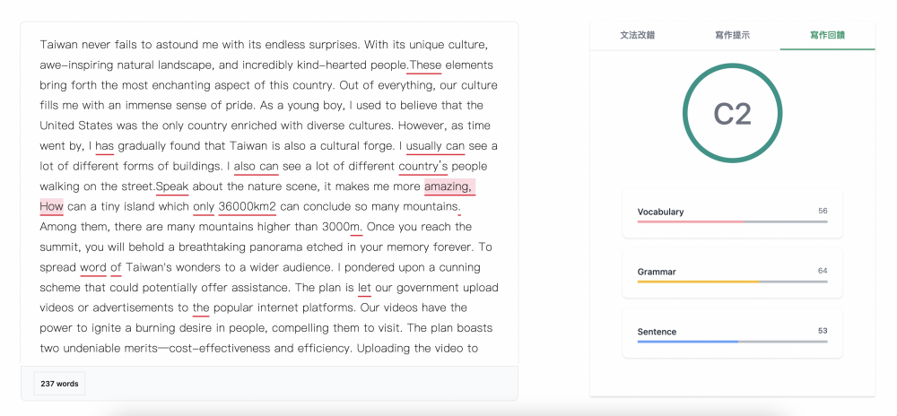 團隊鑽研多年的自然語言處理模型,使系統具備專業且精準的字句與文法改錯、更提供學習者下一步的寫作建議(相關單字與片語用法),並導入 ChatGPT 技術支援句子改寫優化,以及解釋錯誤與改正的方向,另外,寫作評量功能讓您時時看見成長的足跡。