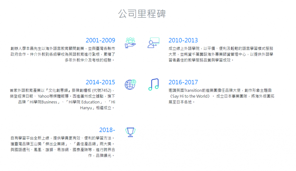 2009年成立迄今,致力推廣語言教育,於菲律賓成立海外師資中心,嚴格培訓人才,創造「心」學習時代,除了提供最有效的個人化學習新模式,也是企業邁向國際,培養外語人才的強力補給站。多年來從不間斷在產品內容師資培訓、教學系統、服務品質上進行優化,獲得多項創新專利肯定,榮得國家品牌玉山獎「傑出企業類」及「最佳產品類」兩項大獎。