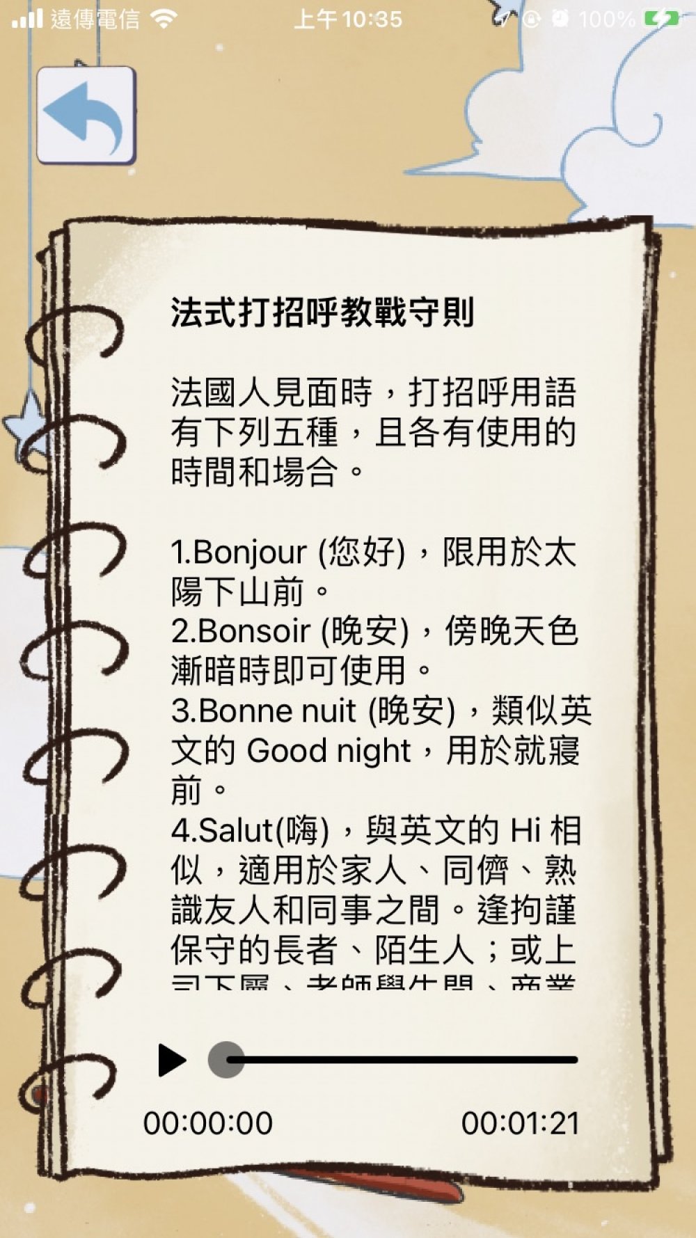 學法語擔心沒機會開口說嗎?,讓小王子陪你模擬對話,幫你解決這個煩惱!透過手機、平板就可以開口練習法語。模擬對話與互動式遊戲強化學習,聽力上有法籍專人配音的純正自然發音、語調;口說上有語音辨識系統評分發音程度,大幅增強法語聽、說能力。課程主題生活化,囊括食、衣、住、行,邊學法語邊了解法國文化,更有文化膠囊帶你領略法國風情。從日常字彙、基本句型到文法秘笈,還有『發音竅門』的貼心教學。由任教於中央、淡江大學法文系的資深優秀教師群編製,內容充實嚴謹,教學由淺入深、循序漸進,法語初學者也適用。