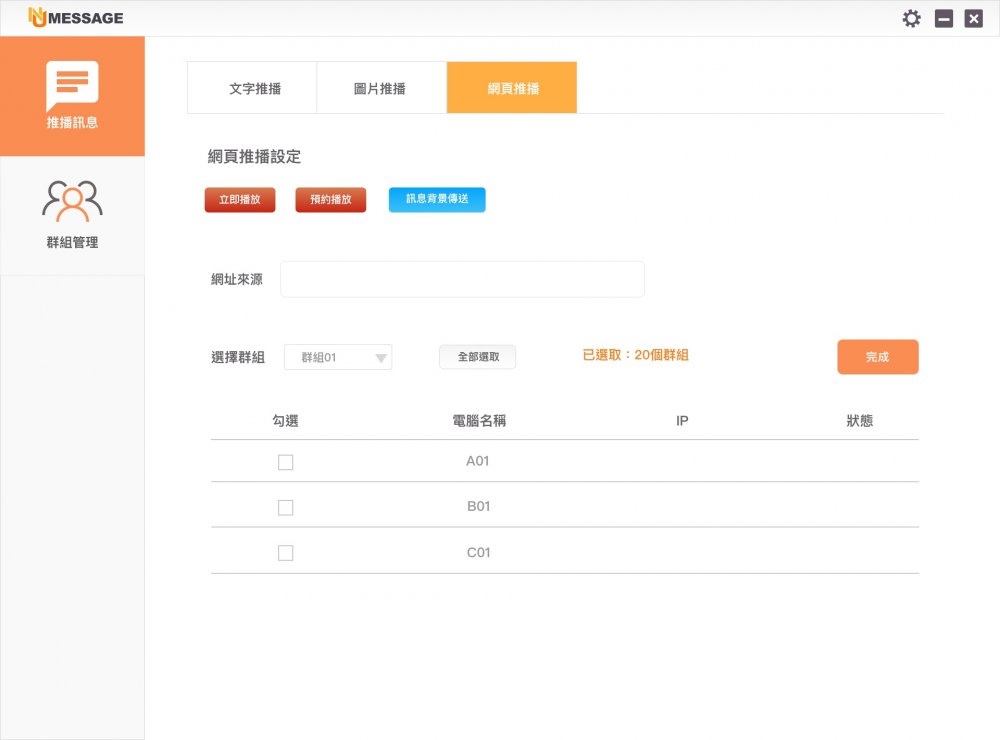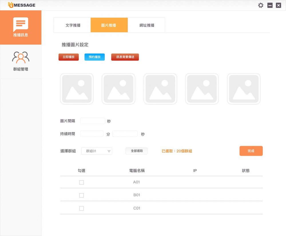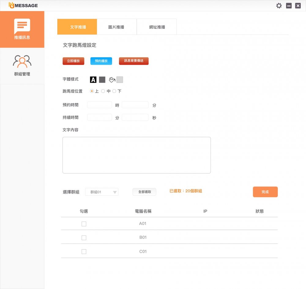 ⚫ 訊息發送分級設計,依緊急重要程度可設定「立即撥放、定時播放、背景傳送訊息夾」三