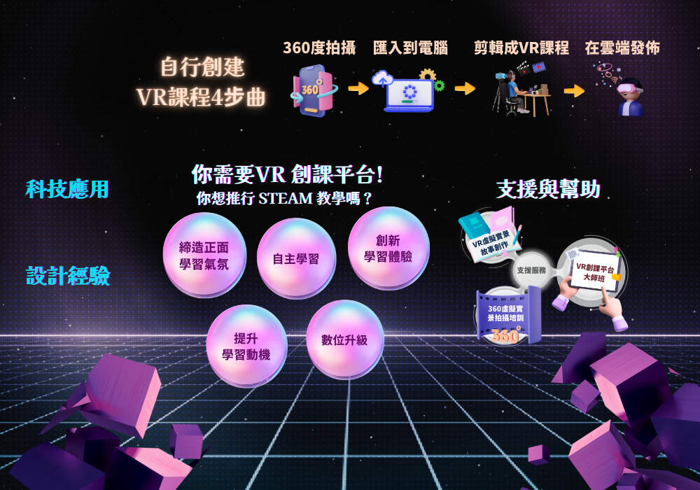 你要選擇甘於現狀,還是跟我們一起踏向未來?15分鐘創造你的VR課程,提升你的教學質素!VR 創課平台是嶄新的教與學工具,可以隨心所欲設計自己的VR課程。
