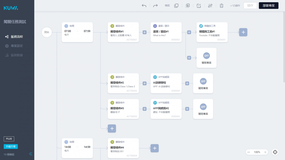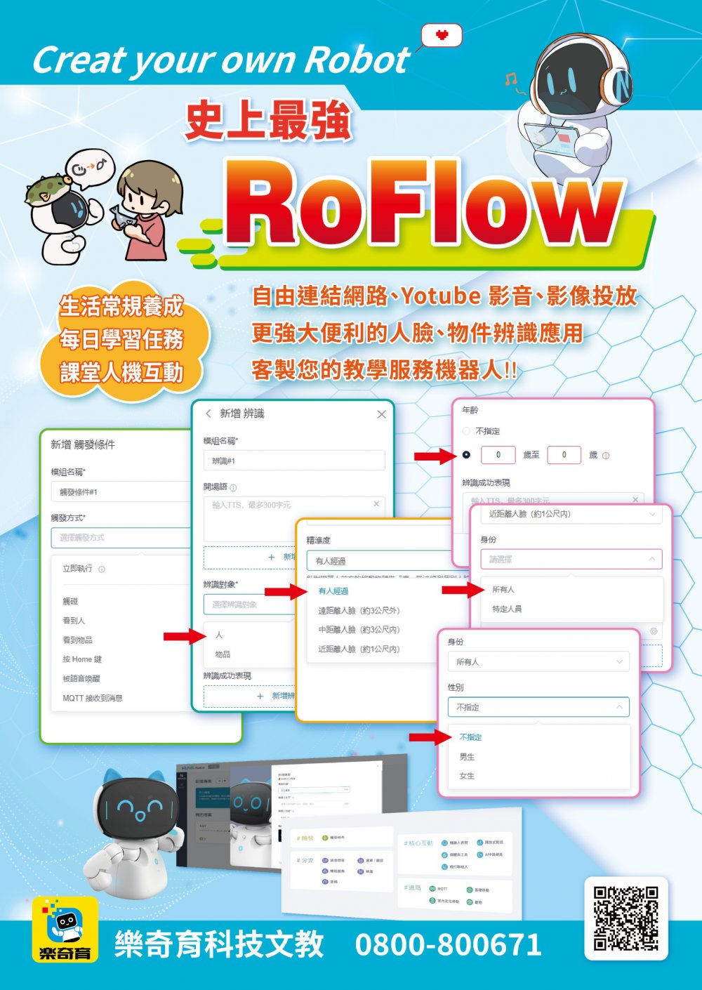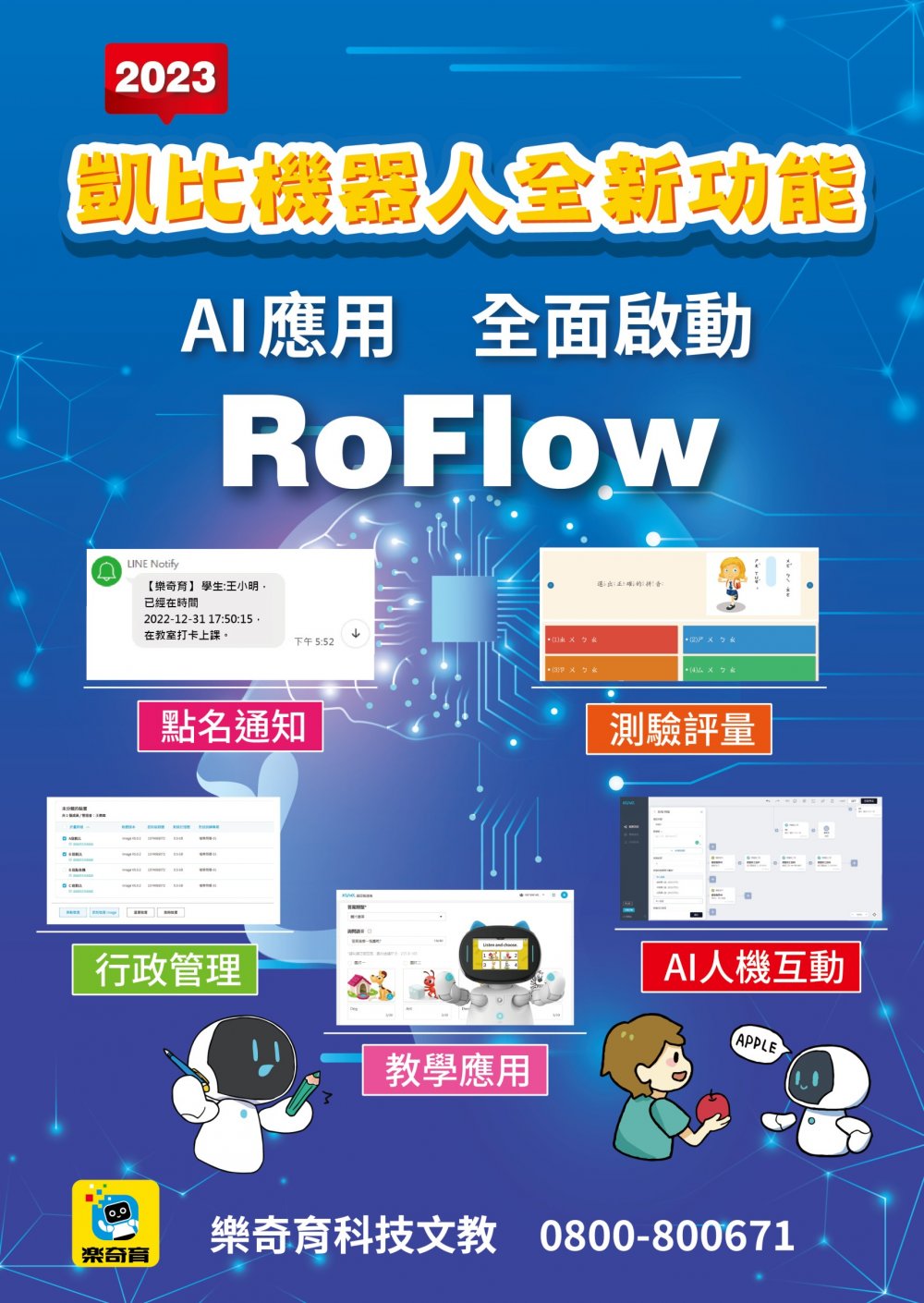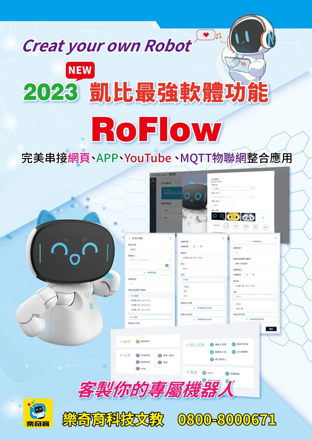 RoFlow為凱比機器人流程設計雲端工具,除可靈活設定機器人自身AI互動功能之外,也可跨平台串接網頁、APP、YouTube等內容結合機器人應用,更可透過MQTT物聯網通訊設定與第三方裝置互動,為凱比機器人上市以來最關鍵應用工具之一,本方案同時配搭RoFlow AI創意GO教材,提供教師教學參考或學生課程使用!