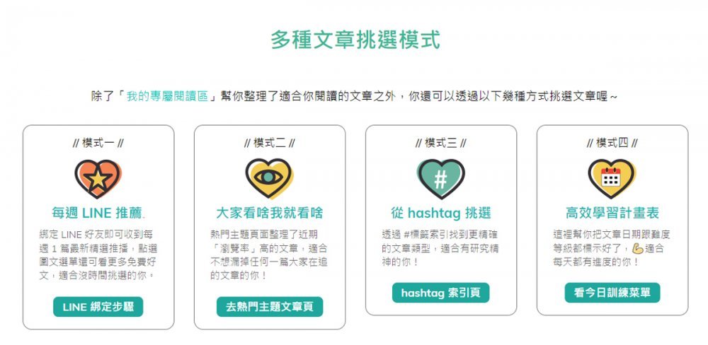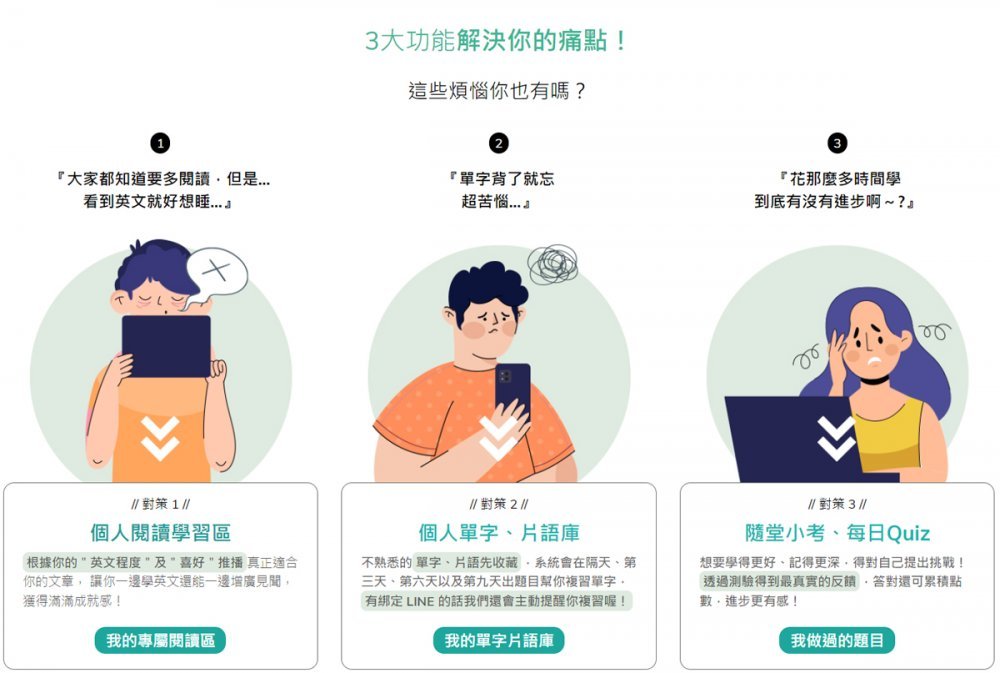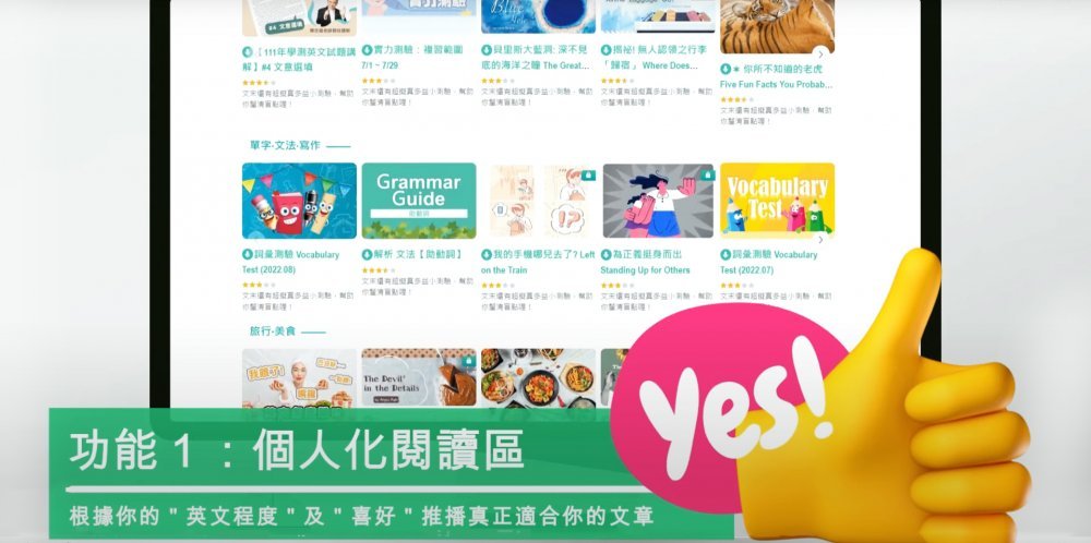 囊括 11 大類各領域優質文章,學習者可設定個人的「閱讀喜好」及「學習難度」且可視需要修改,滿足不同時期的學習需要。完成設定後系統將每週自動推播學習者"感興趣"且"看得懂"的文章,學英文的同時還能增廣見聞,獲得滿滿成就感!