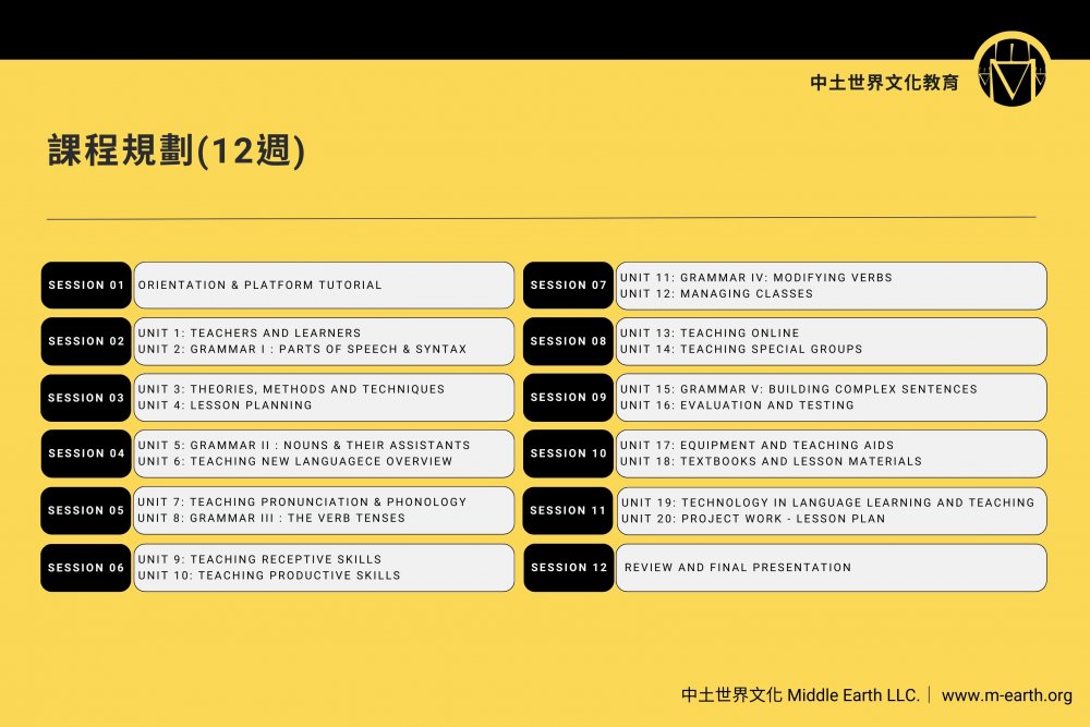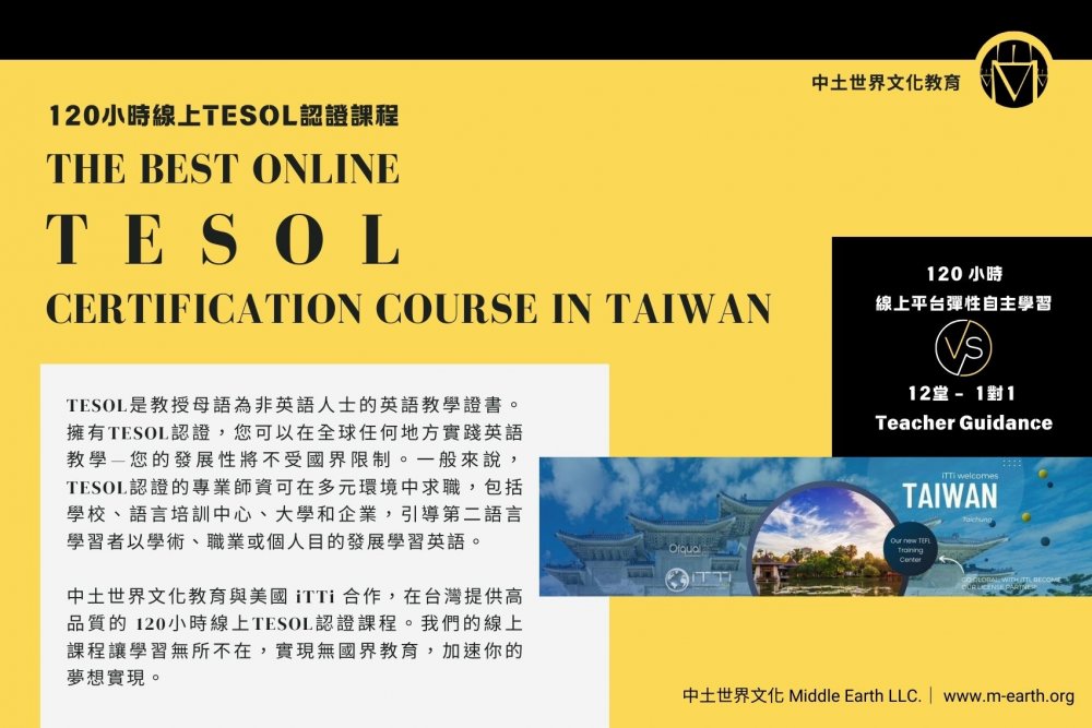 緣此,為因應台灣雙語政策,我司與美國iTTi合作,在台灣開設線上TESOL認證課程 ,以達成兩個主要目標。首先,我們希望調節教師之間的教學品質差異,以提升台灣的英語教學品質。其次,我們旨在真正培養人才的國際授課能力,使他們能夠到世界任何地方擔任英語教師。