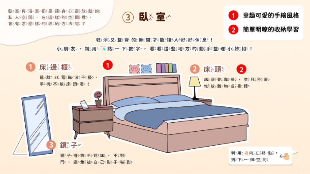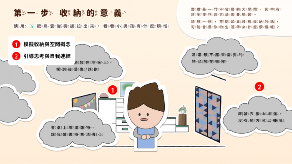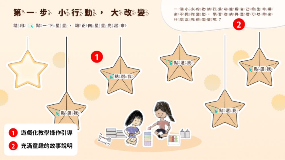 自我管理達人從小學起!帶孩子學收納、學整理、養成良好的生活態度! 當繪本遇上 myViewBoard 數位白板,孩子能夠透過動態的拖拉物件、生動的音檔、佈置專屬於自己的小天地、精心設計的問題討論等等來學習,透過高互動的設計環節引領孩子反思日常生活中的自我行為,從輸入學習變成主動實踐,用一根手指輕鬆學習收納概念。 本教材亦符合學齡前、幼兒教育、素養議題等使用,課堂教師亦能參照國小三年級、四年級綜合活動課程【安全生活不打烊】、【我家的大小事】等單元搭配使用,讓收納學習更加有趣!