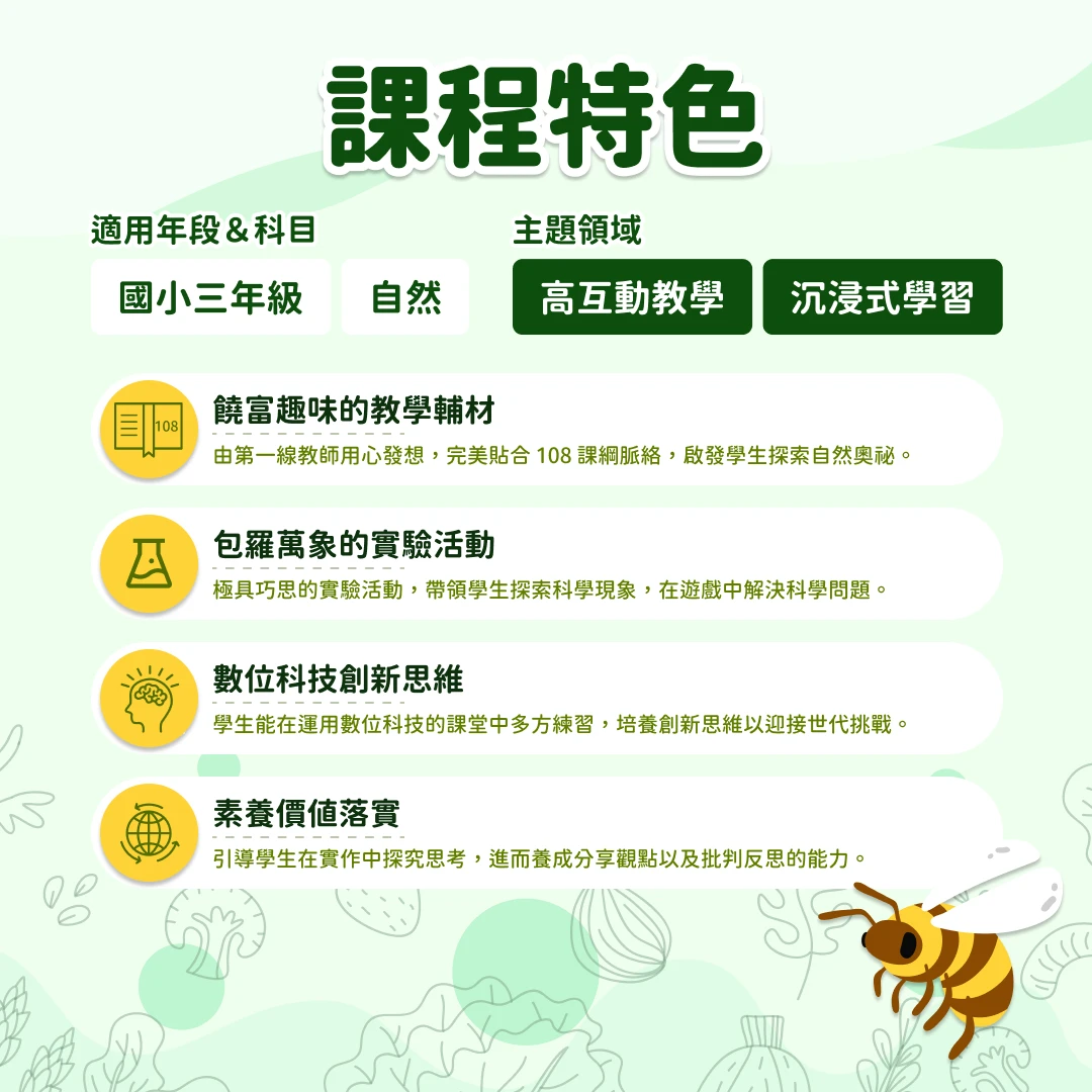 在小學階段,接觸自然科學能讓學生對生活中的現象產生興趣,並培養主動學習和探索的精神。不過,自然科學中的一些概念和原理可能較為抽象和難以理解,學生可以透過這份數位教材中的實驗紀錄、測驗問答及情境模擬,將抽象思維轉化成具體經驗,讓學習與現實生活更緊密結合。如此一來,學生可以更充分理解自然科學的知識理論,並能將所學應用到實際生活中,從而增強學習興趣和深度,更貼近科學教育的本質。