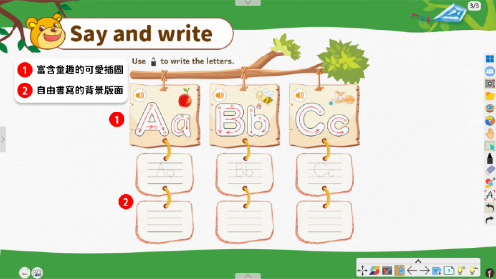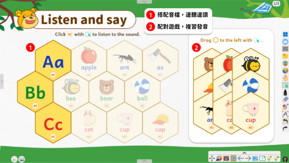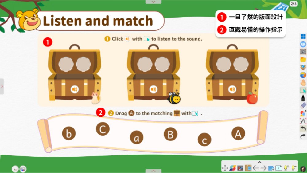 教材內容涵蓋 26 個英文字母、短母音、長母音、子音、複合子音等主題,並搭配外師示範字母與單字的發音,幫助孩子建立精準的發音基礎。此外 myViewBoard 提供多元的互動功能,讓孩子透過拖移物件、點選互動、繪圖等方式,在趣味的遊戲中反覆練習發音與拼字,全面提升聽、說、讀、寫四大英語能力。