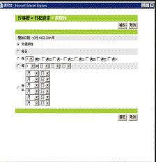 ●週期性或重要大事的行程設定,將您固定週期的資料(如期票、保險到期、親友生日…等),自動記載在行事曆資料庫中,再加上整合行動通訊的功能,行程發生前會以手機簡訊提醒您,讓您絕對不會再錯過任何重要的行程。